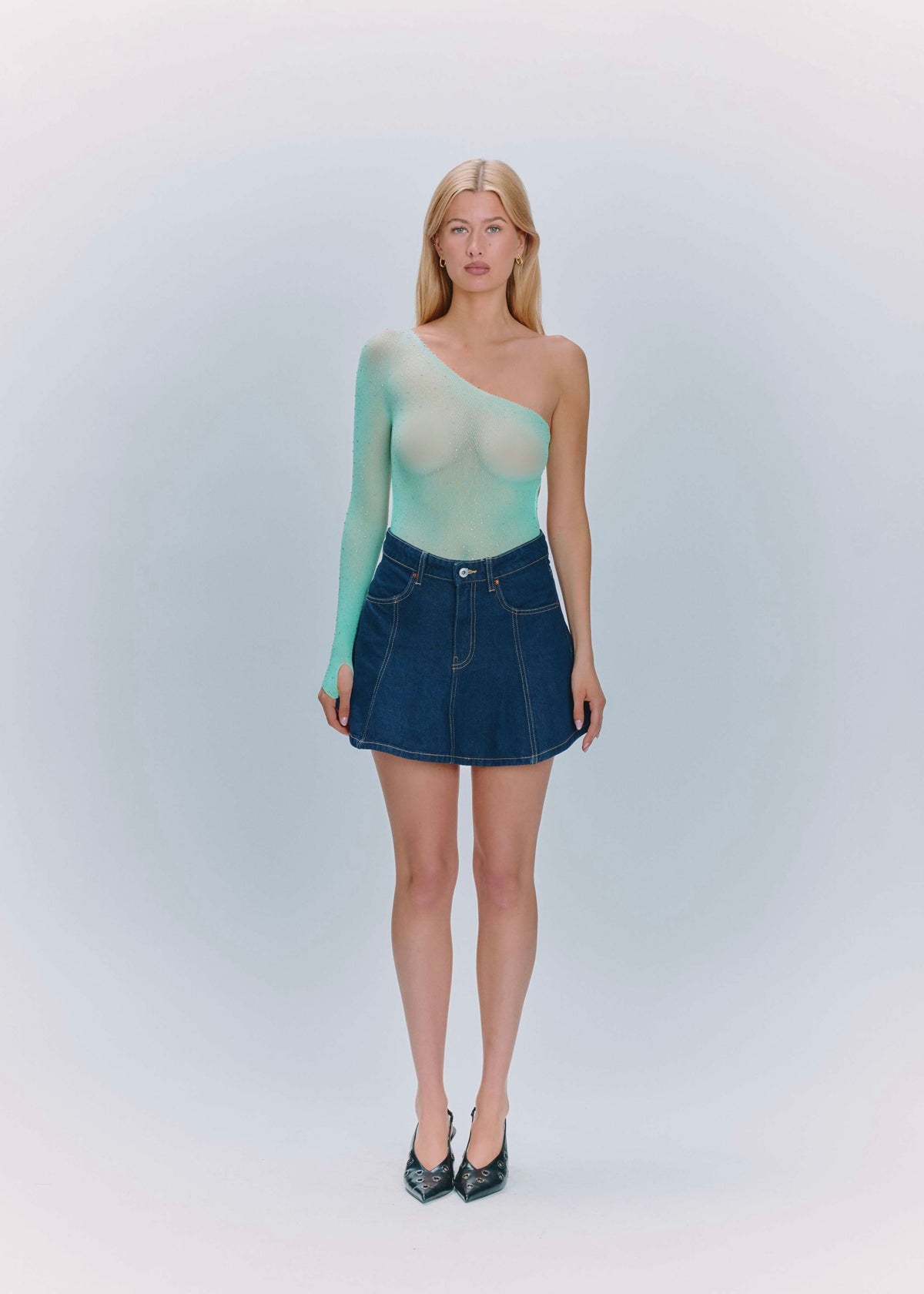 Body de Ariel de un solo hombro, color verde menta.